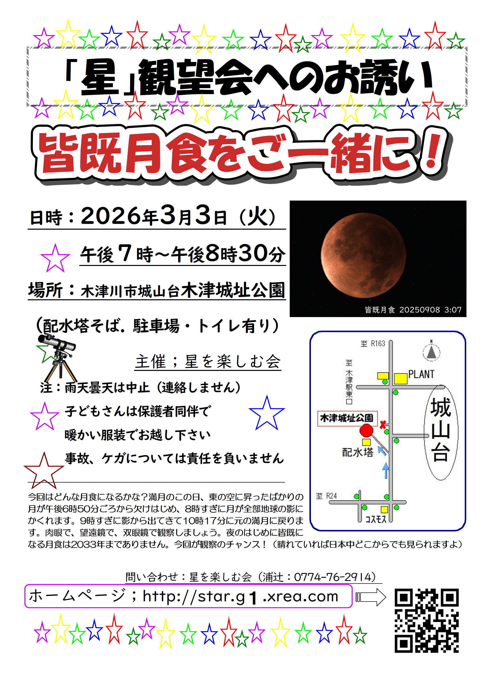 ようこそ 星を楽しむ会のホームページへ。 星を楽しむ会は、京都府木津川市を中心に「星見」をみんなで楽しもうと、 「観望会」や「講座」を開いたり、望遠鏡や双眼鏡を持って各地を訪ねたり しているグループです。 木津川市の南加茂台公民館サークルに所属しています。 このサイトでは、おもに観望会の案内をしています。 興味をお持ちの方は、ぜひご一緒に夜空を見上げてみませんか? どなたでも参加していただけますよ。